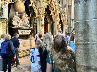 Meet your kid-friendly guide in front of Westminster Abbey and start your journey through the history of this iconic church! Your Blue Badge guide will show you the interior of the Abbey. Learn about the Abbey's role in the coronation of all English and British monarchs since William the Conqueror in 1066, and discover the final resting places of 17 kings and queens, and notable individuals like Isaac Newton, Charles Dickens, and Charles Darwin. Your guide will make history fun for the whole family, highlighting key spots like the Lady Chapel, Coronation site, Poet's Corner, the 700-year-old Coronation Throne, the Tomb of the Unknown Warrior, and the wedding site of Prince William and Kate Middleton.ย